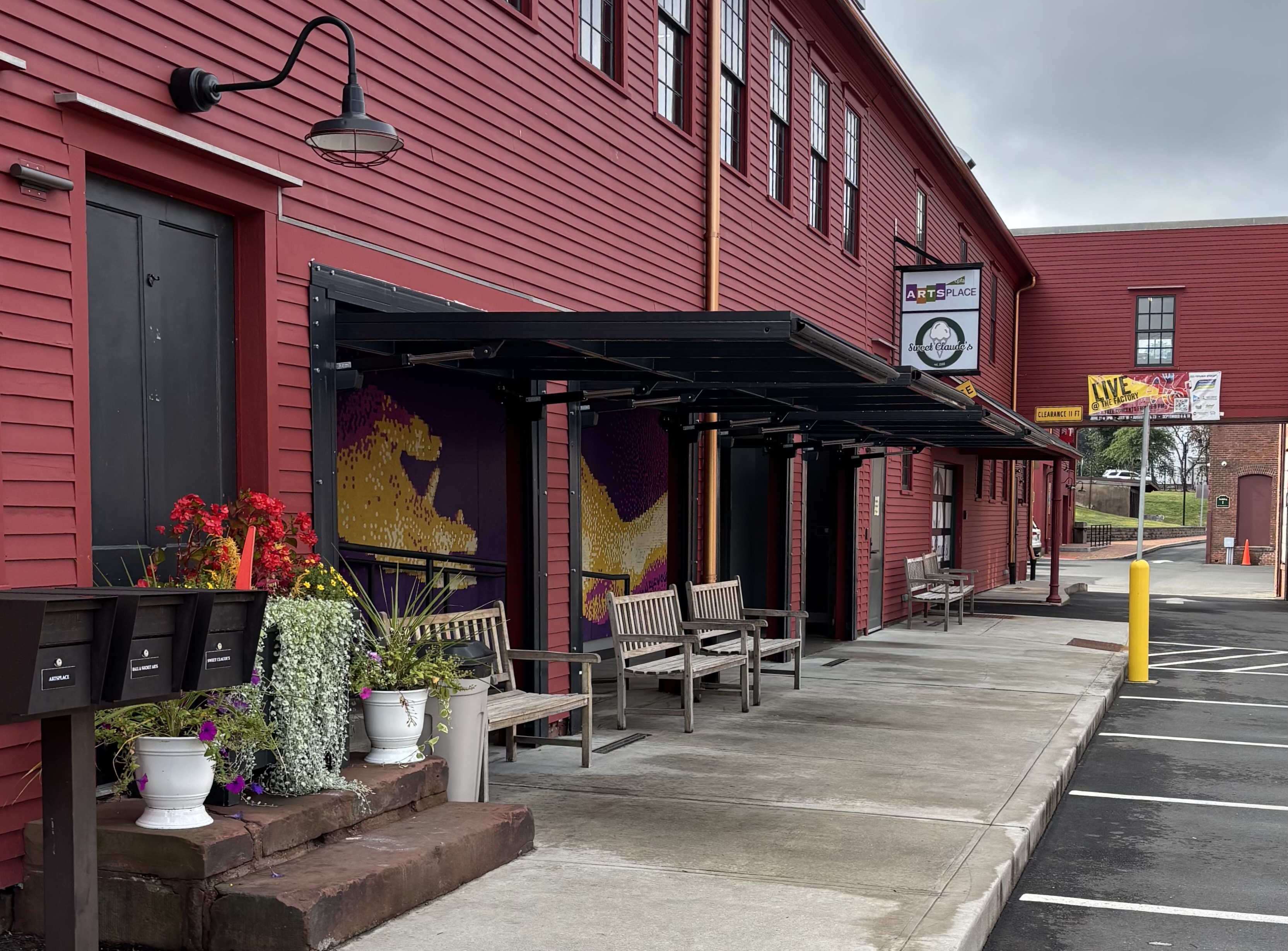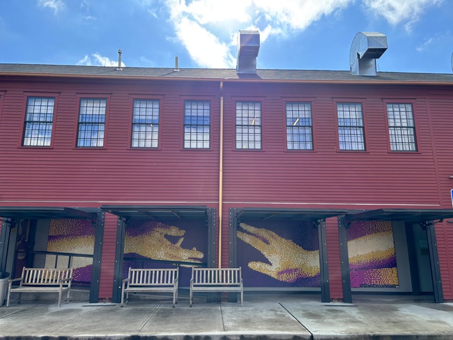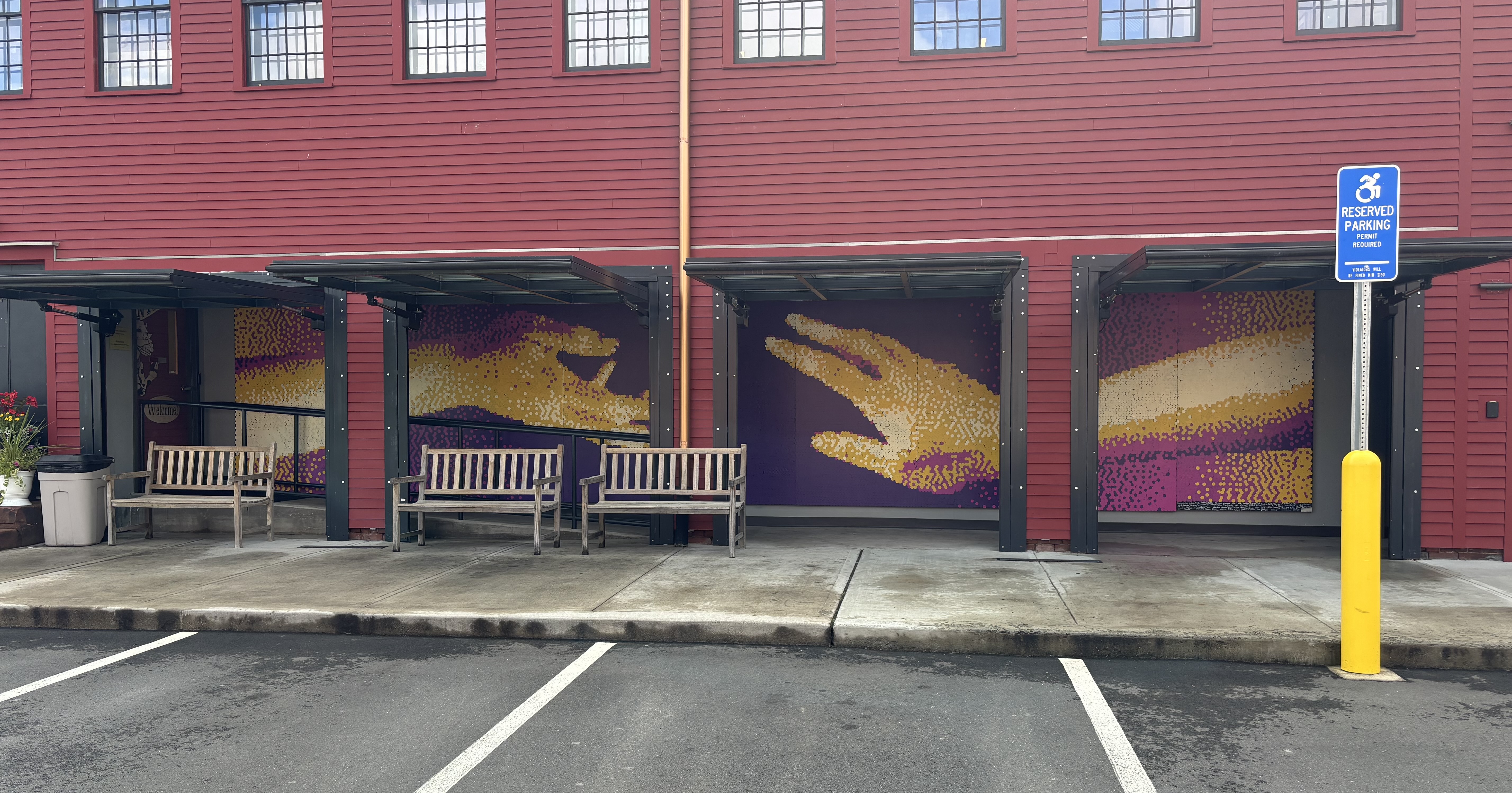 The space for the mural is a long hallway with bay doors that open onto the parking lot. The posts between the doors obstruct the view of the mural, something we considered as we searched for what the image would be. Once we settled on the image, we used mockups to make sure we liked the way the bay doors would frame it.