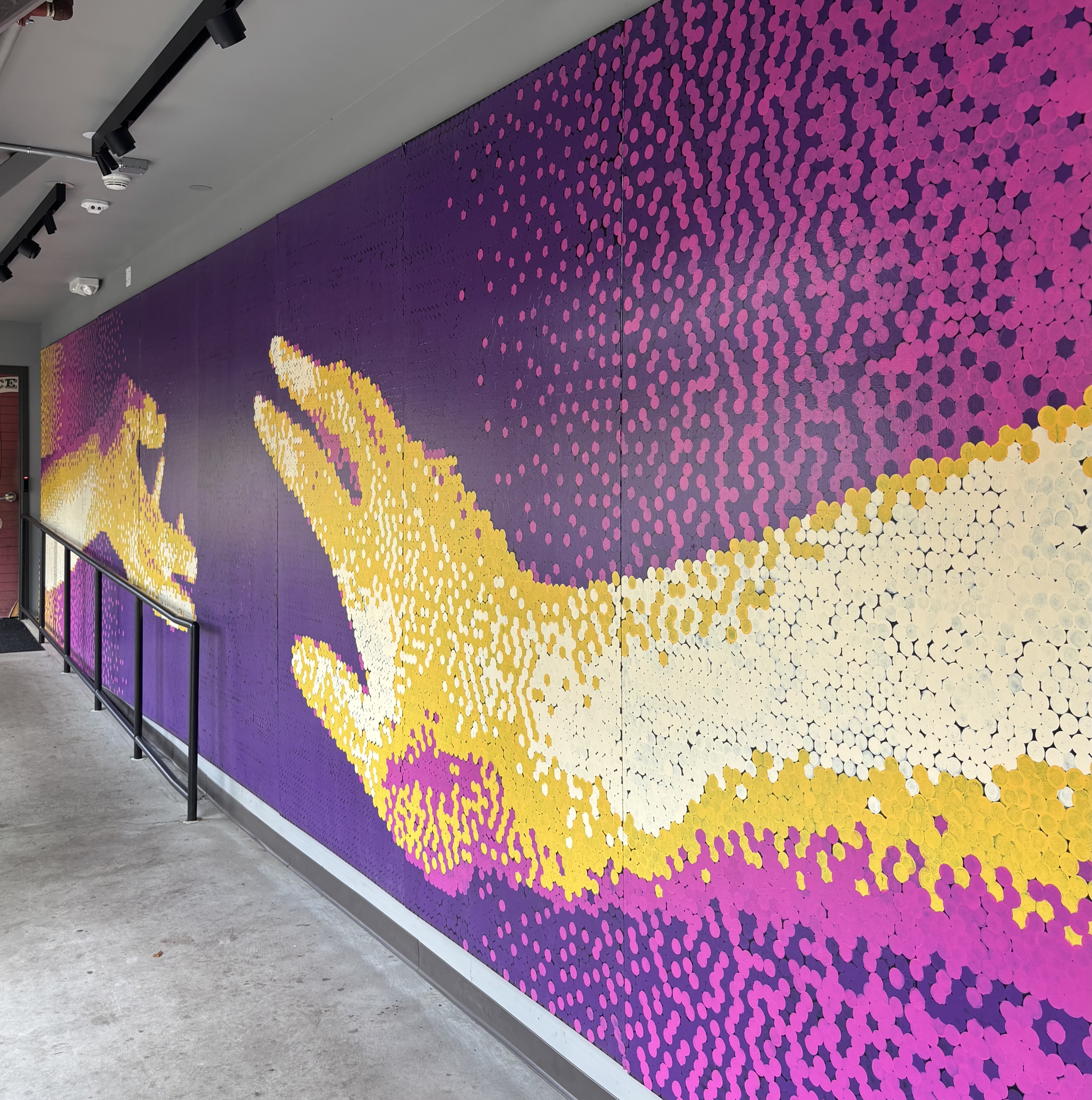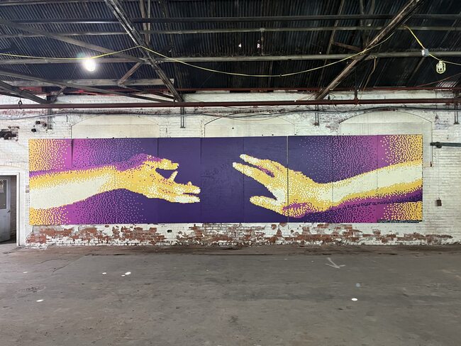 In February 2025 Ball and Socket Arts asked me and Dan Gries to make a mural for their Artcade. As we worked on it, Rita Lombardi contributed so much (including the source images: her photographs, of her hands) that we made her a full partner in the project. Six months later, over 80 volunteers came together in Cheshire to paint more than 34,000 dots in ten hours across nine 4’x8’ plywood boards. Almost none of them knew what the image was while they were working on it.